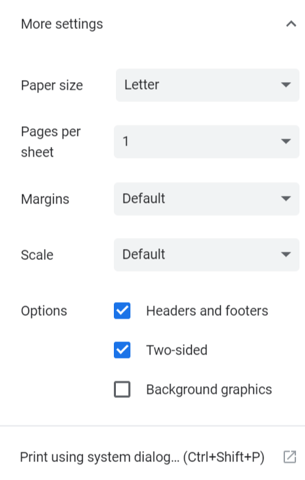 At the bottom expand more settings, scroll to the bottom and select background graphics. Select file > print · 2. Use 'ctrl' + 'p' to get to the print dialogue. Click the checkbox to enable print background (colors and images) . How to print a poster.